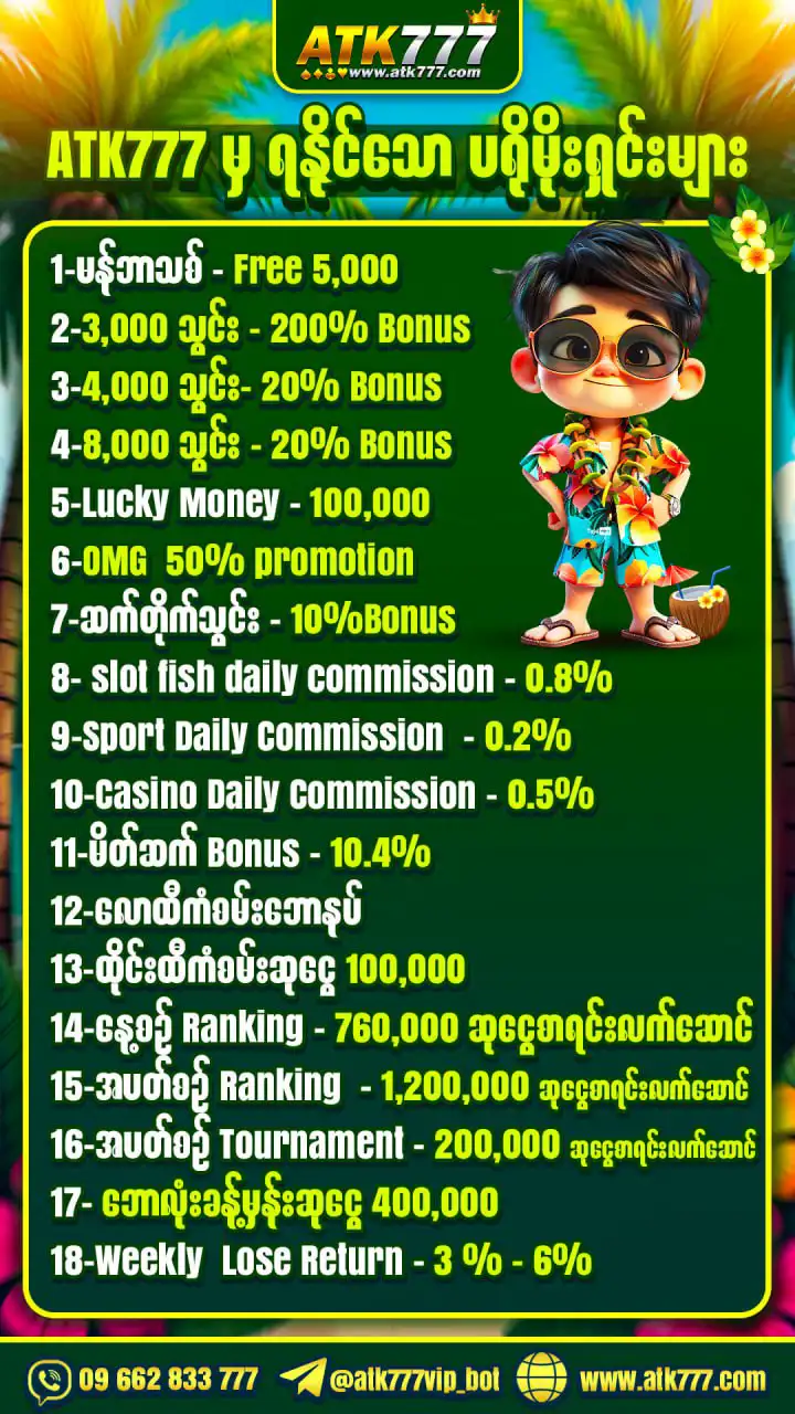 ATK777 / 777kyat / GOLD88 သည် ယနေ့ခေတ်တွင် လူကြိုက်များနေသော အွန်လိုင်းအာနိသင်ကစားမှုပလက်ဖောင်းတစ်ခုဖြစ်သည်။ ပထမဦးဆုံးအသုံးပြုရန်အတွက် အကောင့်ဖွင့်ခြင်း၊ ငွေဖြည့်ခြင်းနှင့် ငွေထုတ်ခြင်းနည်းလမ်းများကို အောက်တွင်လေ့လာနိုင်ပါသည်။